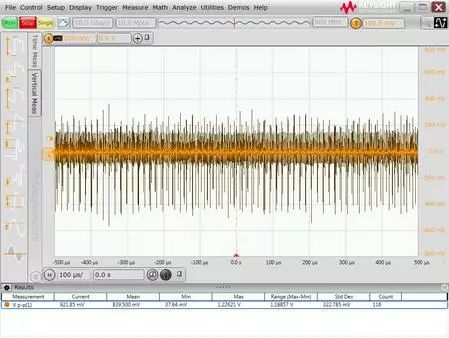 某用户在用500MHz带宽的示波器对其开关电源输出5V信号的纹波进行测试时,发现纹波和噪声的峰值达到了900多mV(如下图所示),而其开关电源标称的纹波的峰值<20mv。虽然用户电路板上后级还有LDO对开关电源的这个输出再进行稳压,但用户认为测得的这个结果过大,不太可信,希望找出问题所在。