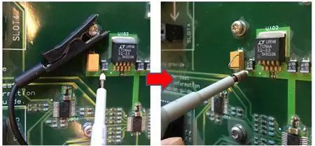 电源纹波测试过大的问题通常和使用的探头以及前端的连接方式有关。首先检查了用户探头的连接方式,发现其使用的是如下面左图所示的长的鳄鱼夹地线,而且接地点夹在了单板的固定螺钉上,整个地环路比较大。由于大的地环路会引入更多的开关电源造成的空间电磁辐射噪声以及地环路噪声,于是更换成如下面右图所示的短的接地弹簧针。