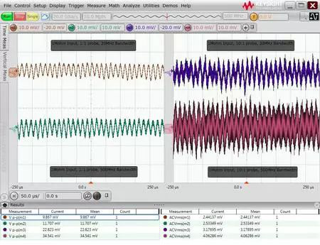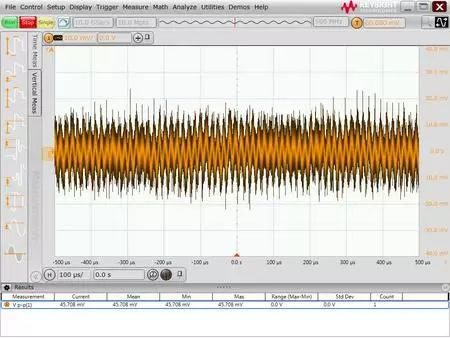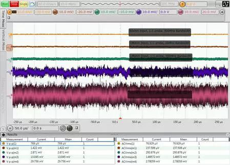 在进行实际测试之前,一个比较好的习惯是先检查一下当前使用的设备和设置下的系统的底噪声。下面图中的5个波形分别是使用500M的S系列示波器在使用不同的探头和带宽设置下的底噪声结果。波形从上到下依次为:50欧姆输入阻抗,1:1探头,500MHz带宽;1M欧姆输入阻抗,1:1探头,20MHz带宽;1M欧姆输入阻抗,1:1探头,500MHz带宽;1M欧姆输入阻抗,10:1探头,20MHz带宽;1M欧姆输入阻抗,10:1探头,500MHz带宽。其底噪声的峰峰值从不到1mV直到接近30mV,可见测试中探头、带宽、输入阻抗设置的重要性。